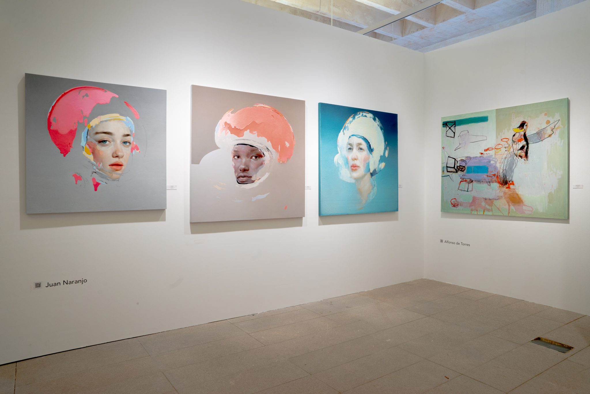 La obra de Juan Naranjo destaca por la maestria figurativa del retrato clásico envuelto en detalles de pinceladas sueltas abstractas y contemporáneas. Personajes sin nombres muestran la necesidad de protegerse, de aislarse frente al mundo actual. Prótegidos por un casco abstracto, como una burbuja imaginaria que le aísla de todo lo que ocurre alrededor, creciendo en un mundo interior sutíl y criogenizado.